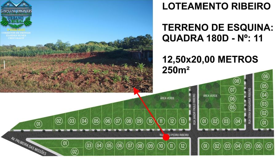 CAPITAL IMÓVEIS: VENDE - LOTE URBANO - Terreno de 250m² com 12,50 metros de frente, na Rua João Pedro Ribeiro, Bairro Ribeiro em Crissiumal - RS. LOTE URBANO: Terreno de Esquina de 12,50×20,00 metros com uma área de 250m²;
